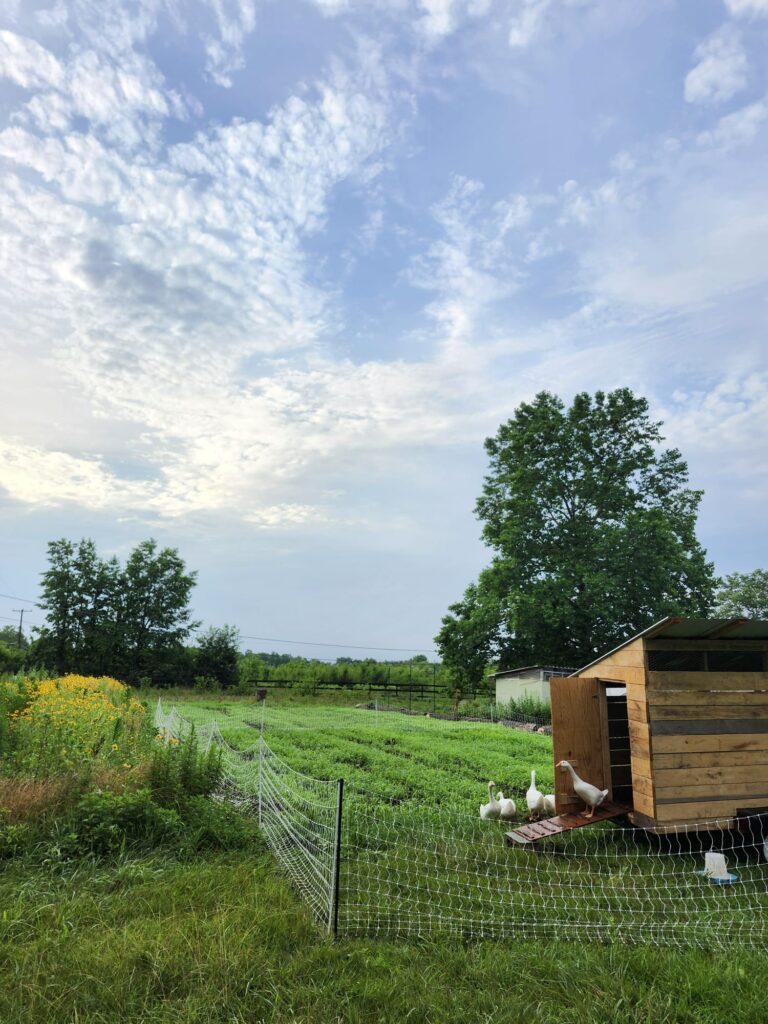 We are first generation farmers with horticulture and environmental science degrees who began working on farms in 2012. Shortly after meeting, we embarked on a whirlwind adventure starting the farm, getting married, and welcoming farmer-in-training, Emmylou! Our crew has grow to include Arlo the dog, 2 cats, and a variety of geese and chickens! In 2025 we were joined by our littlest farm girl, Beatrix! We are still taking each day as it comes and moving through life with gratitude.